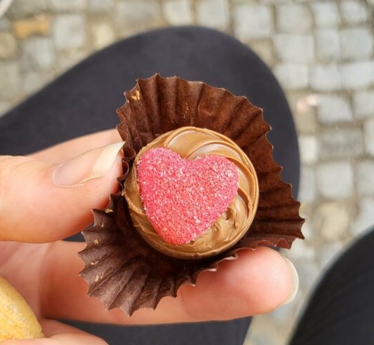 Neben Eis bekommt ihr, wie der Name bereits verspricht, auch Schokolade und kleine handgemachte Pralinen. Wir hatten eine mit Nuss-Nougat gefüllte Praline. Sie war genauso lecker wie hübsch. Der Preis hat sich mit 6,90€ pro 100gr aber gewaschen.